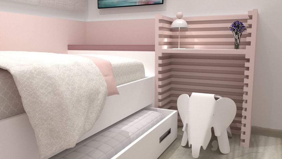 Para a sala utilizamos uma das cores lançamento da Suvinil de 2023, que ficou lindo! Utilizamos a cor Azul no ripado do balcão entre a sala de jantar e a cozinha, no quarto da criança, utilizamos o rosê, que ficou um espetáculo.