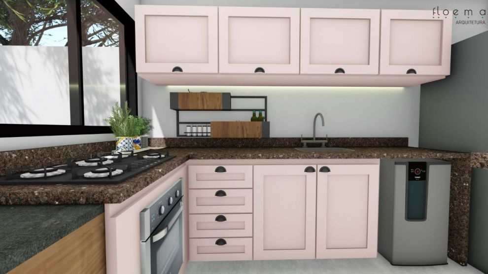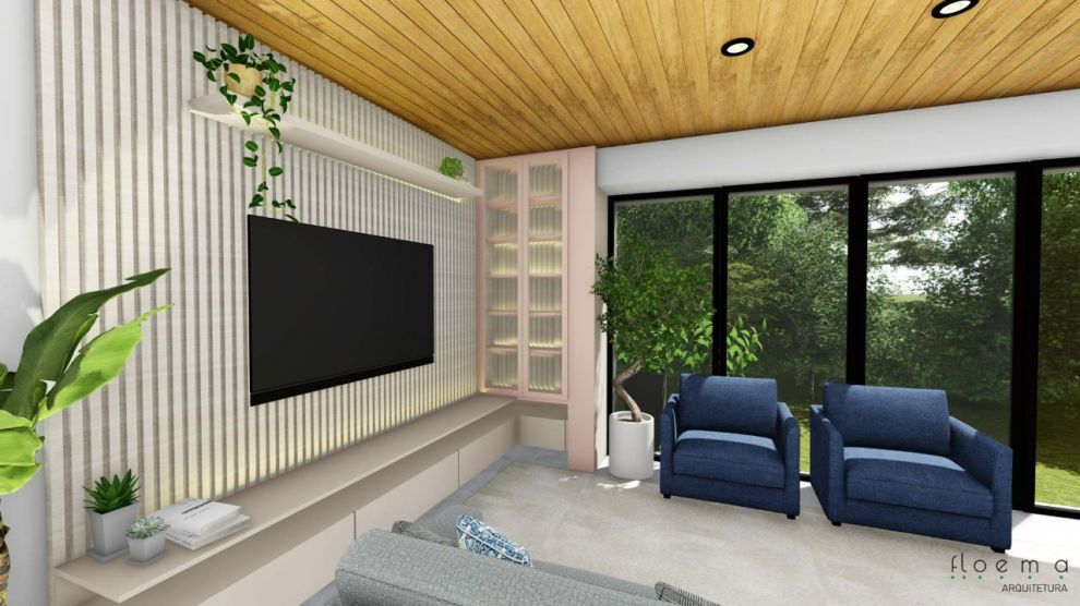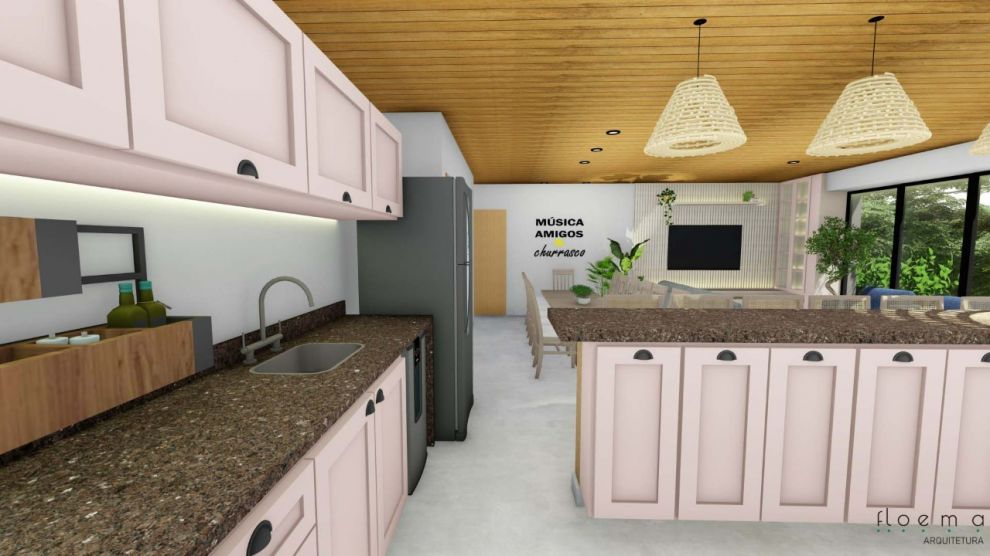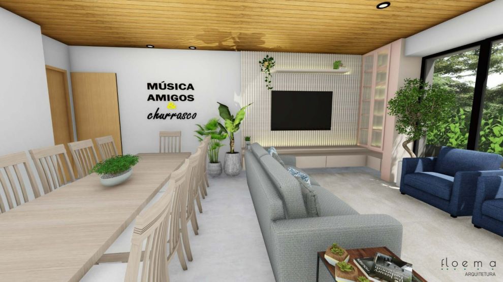 Linda Área social localizada em Curitiba -PR, os clientes nos pediram algo bem unido, moderno e aconchegante, para a pegada mais moderna já pensamos diretamente no ripado, que está muito em alta. Colocamos uma grande mesa, pois eles recebem vários amigos e familiares em casa, utilizamos também o espaço da bancada perto da churrasqueira, na qual podemos ter um maior aproveitamento do lugar. A parte da cozinha desta área social, foi utilizada um tom de cor diferenciado, usamos um rosa claro, pela escolha dos clientes. Por fim adicionamos algumas plantas para dar um verde natural no ambiente.