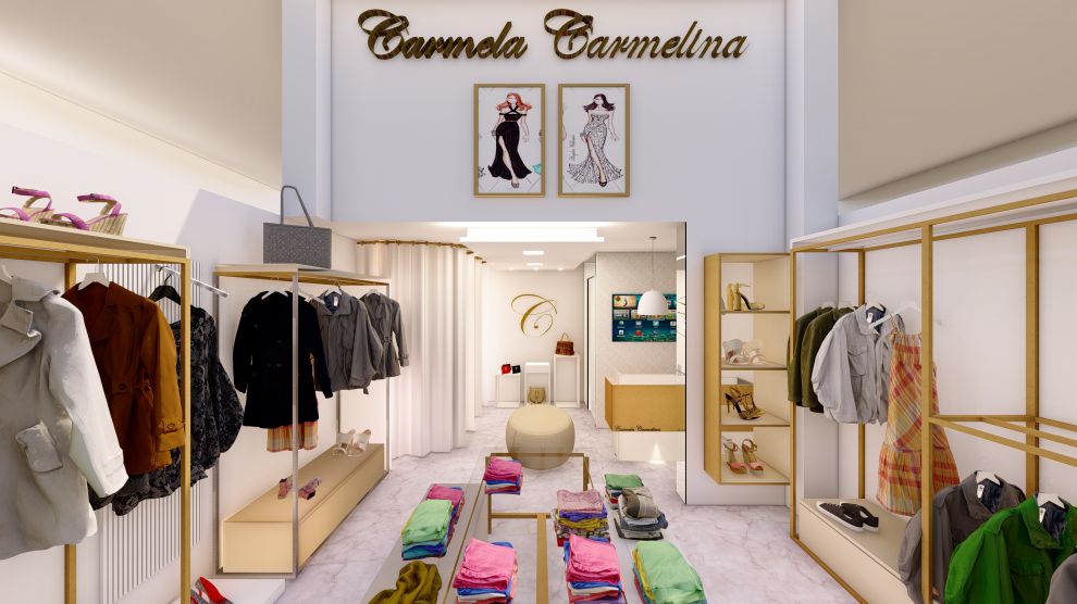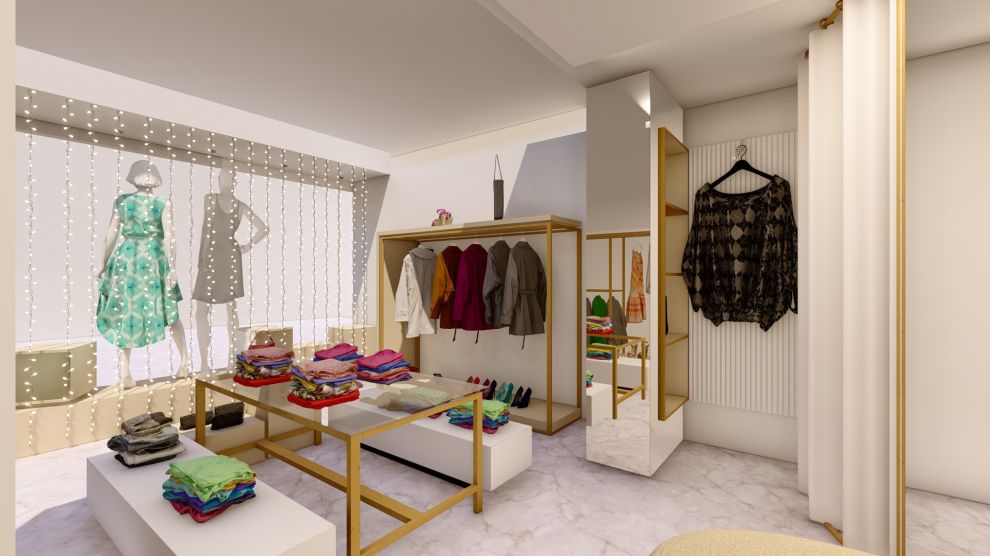 Essa botique linda e maravilhosa foi pensada no intuito de trabalhar com a iluminação na vitrine, como vemos essa linda cortina de luzes atrás dos manequins. Na parte interna, trabalhamos com toda a paleta de dourado e branco, para dar aquele ar de modernidade e sofisticação.
