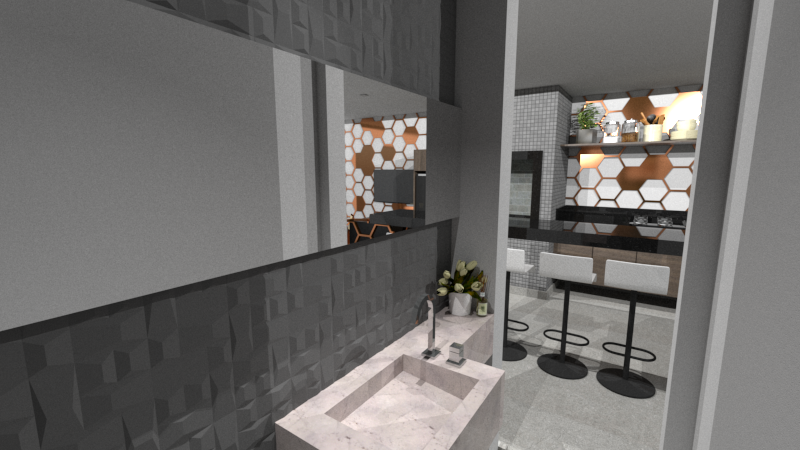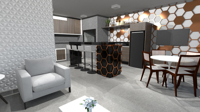 Neste projeto realizamos a cozinha, com a churrasqueira integrada, utilizamos um painel de metal em formato de colmeia. Decidimos utilizar essa cor pois está no auge, e deu um toque especial para a cozinha que tem como base cinza, branco e alguns detalhes de preto.