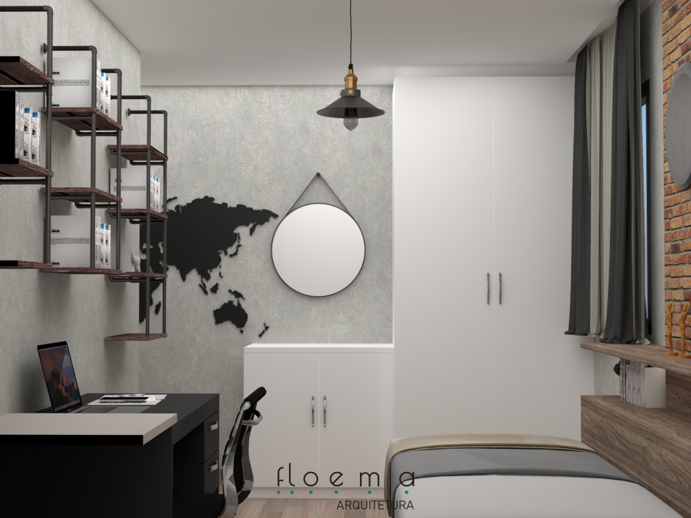 Quarto Jovem e cheio de vida, apesar das cores mais neutras escolhidas pelo jovem. Cada parte deste quarto foi pensada unicamente para o gosto dele, utilizamos papel de parede na parede supeior da cama, ao lado utilizamos nichos abertos de ferro e na base o Mdf em um tom mais escuro. Também fizemos para ele uma escrivaninha para estudo do jovem.
